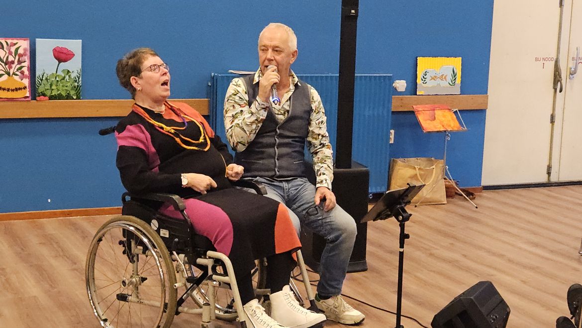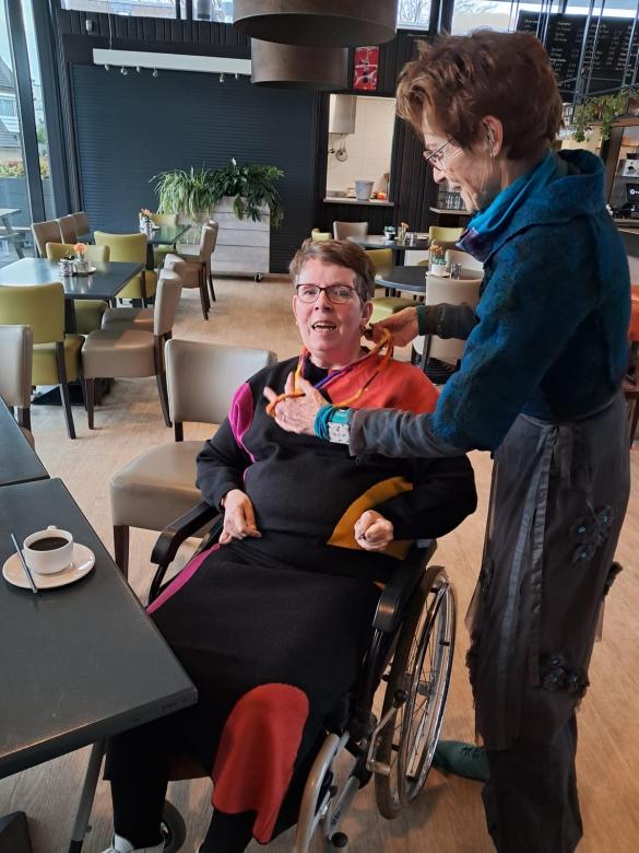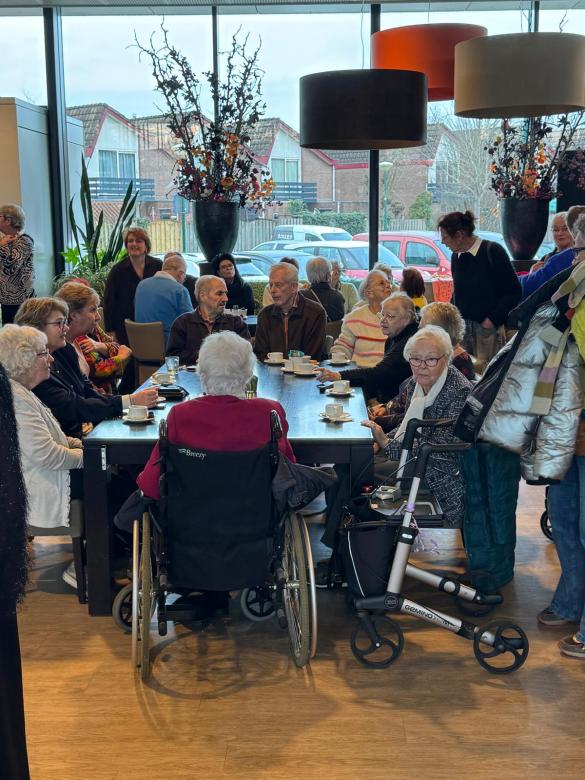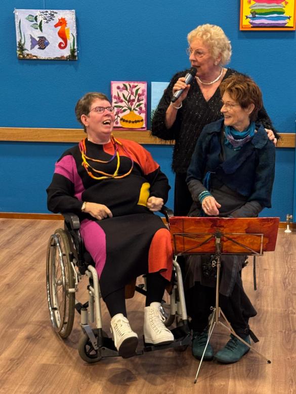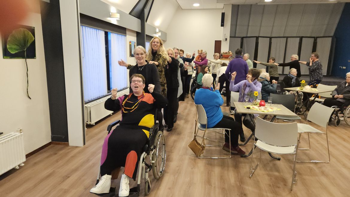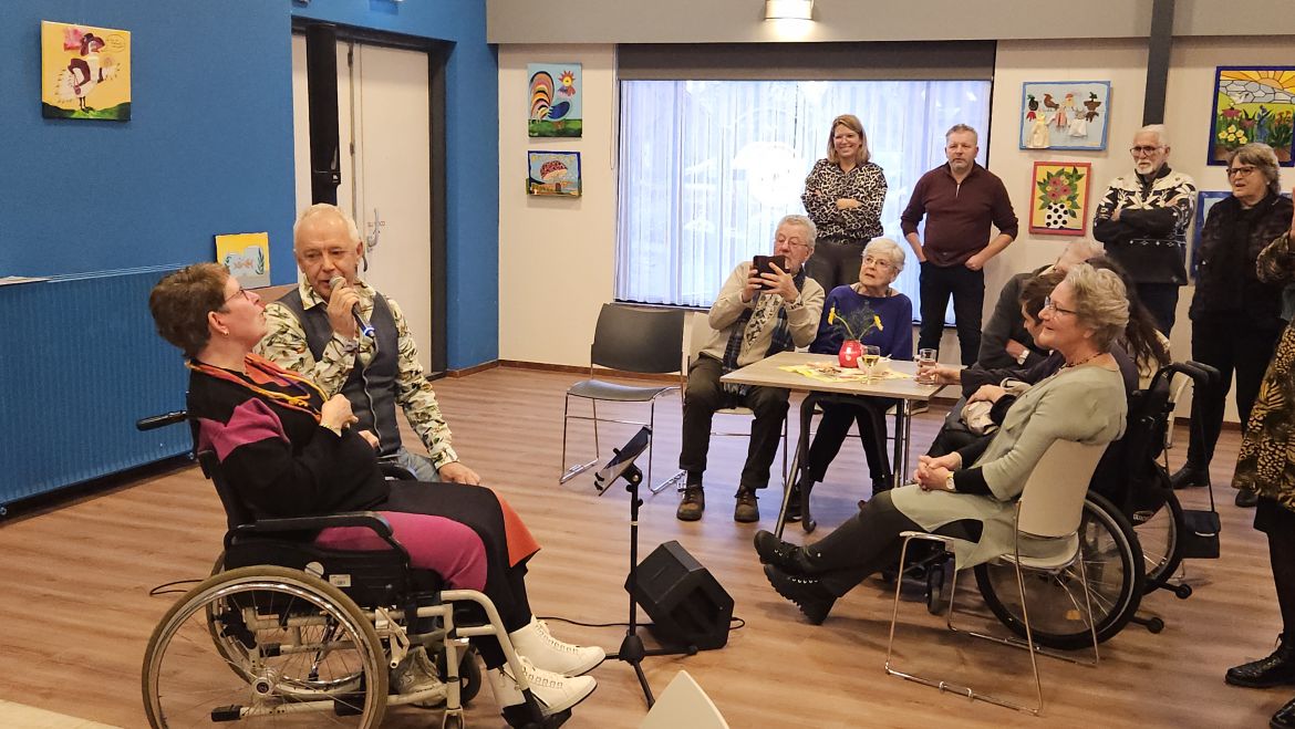 Na een gezellige start in de foyer van de Schouw, kon Carla haar tentoonstelling rond half vier openen. Met muzikale omlijsting van Fons en David kon iedereen de schilderijen bewonderen en kopen. Er zijn wel 38 schilderijen verkocht! Met hulp van begeleiders Marian en Erna; en het team van de Schouw hebben we een prachtige middag meegemaakt. Eindigend met een polonaise met een volop genietende